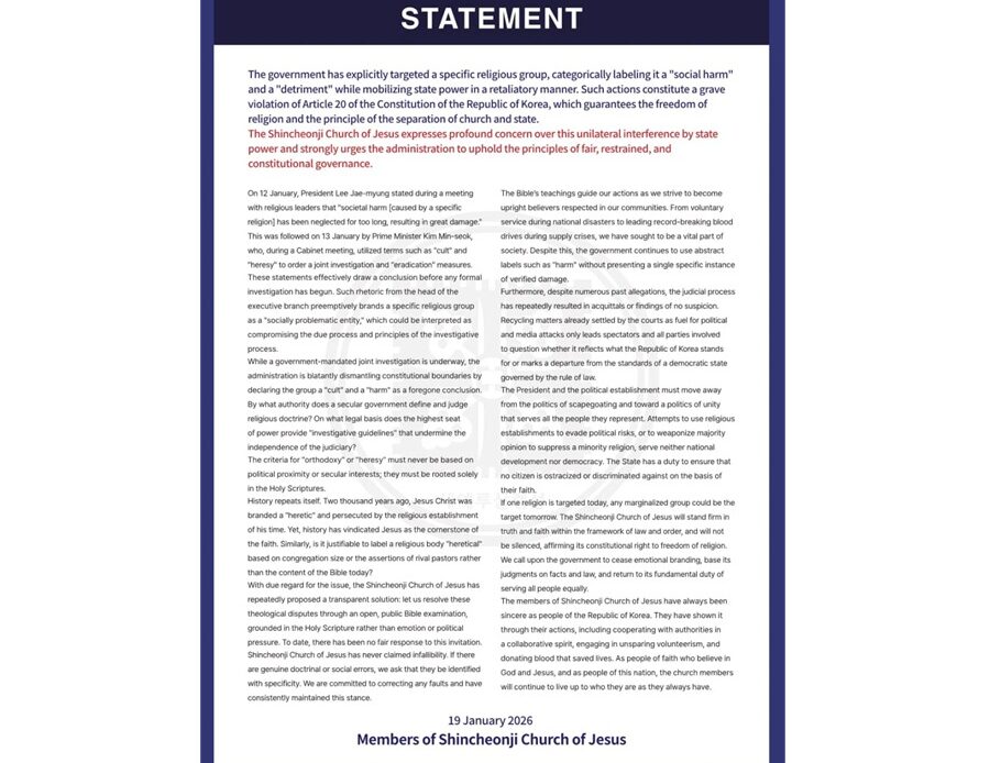 On 12 January, President Lee Jae-Myung stated during a meeting with religious leaders that “societal harm [caused by a specific religion] has been neglected for too long, resulting in great damage.” This was followed on 13 January by Prime Minister Kim Min-seok, who, during a Cabinet meeting, utilized terms such as “cult” and “heresy” to order a joint investigation and “eradication” measures.